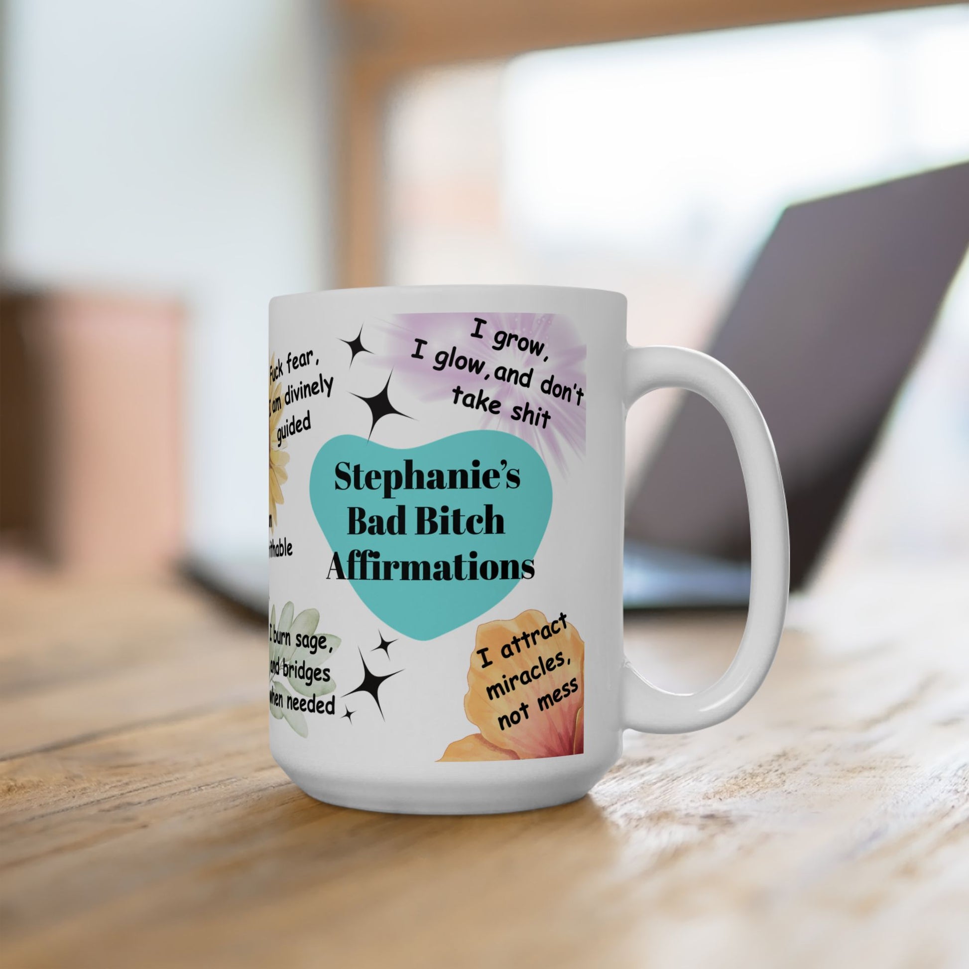 Empower your mornings with this personalized Bad Bitch Affirmations mug, a bold 15oz coffee cup designed to boost confidence and manifest good energy with every sip. Perfect for strong, spiritual, and self-loving women, this custom affirmation mug makes the ultimate gift for confident best friends or self-care queens.