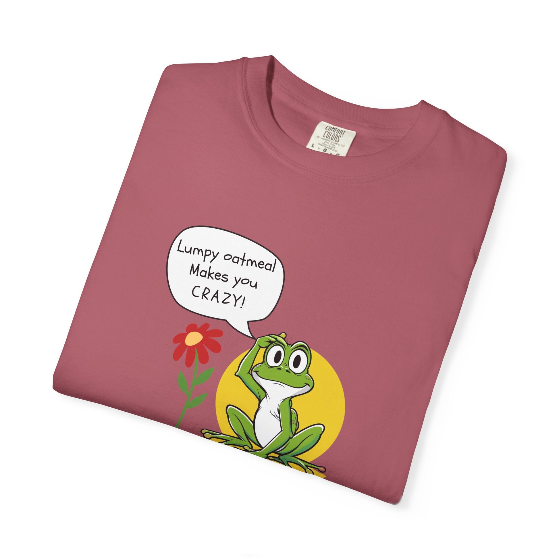 Bring back the quirky charm of childhood with this playful Lumpy Oatmeal Makes You Crazy tee! Featuring a wide-eyed cartoon frog, a cheerful flower, and a retro-style quote bubble, this shirt is equal parts silly, nostalgic, and fun. Inspired by a friend’s childhood tee, it’s a design that feels like a blast from the past—with a modern, comfy twist.