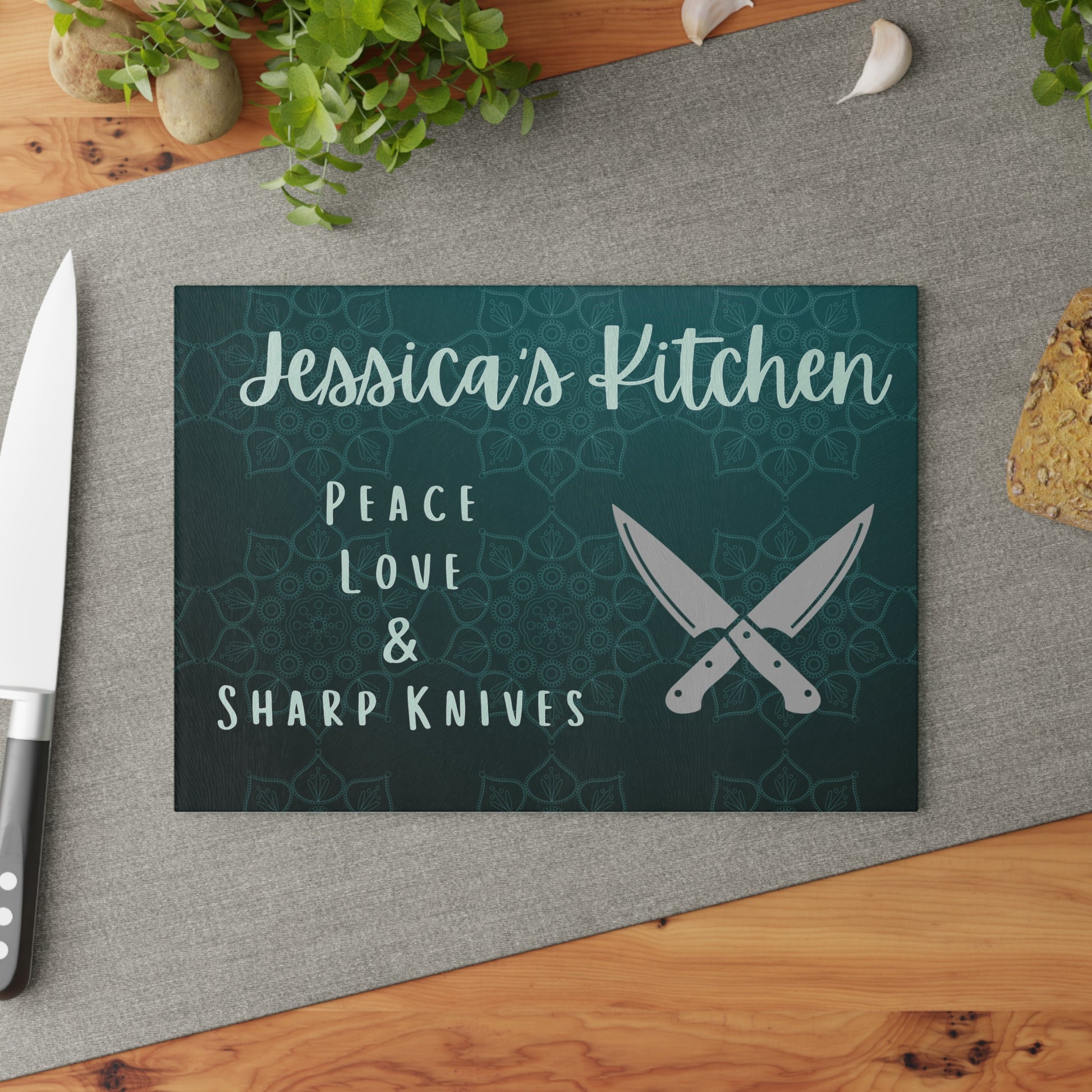 Personalized Glass Cutting Board - 'Peace Love & Sharp Knives' Kitchen Decor